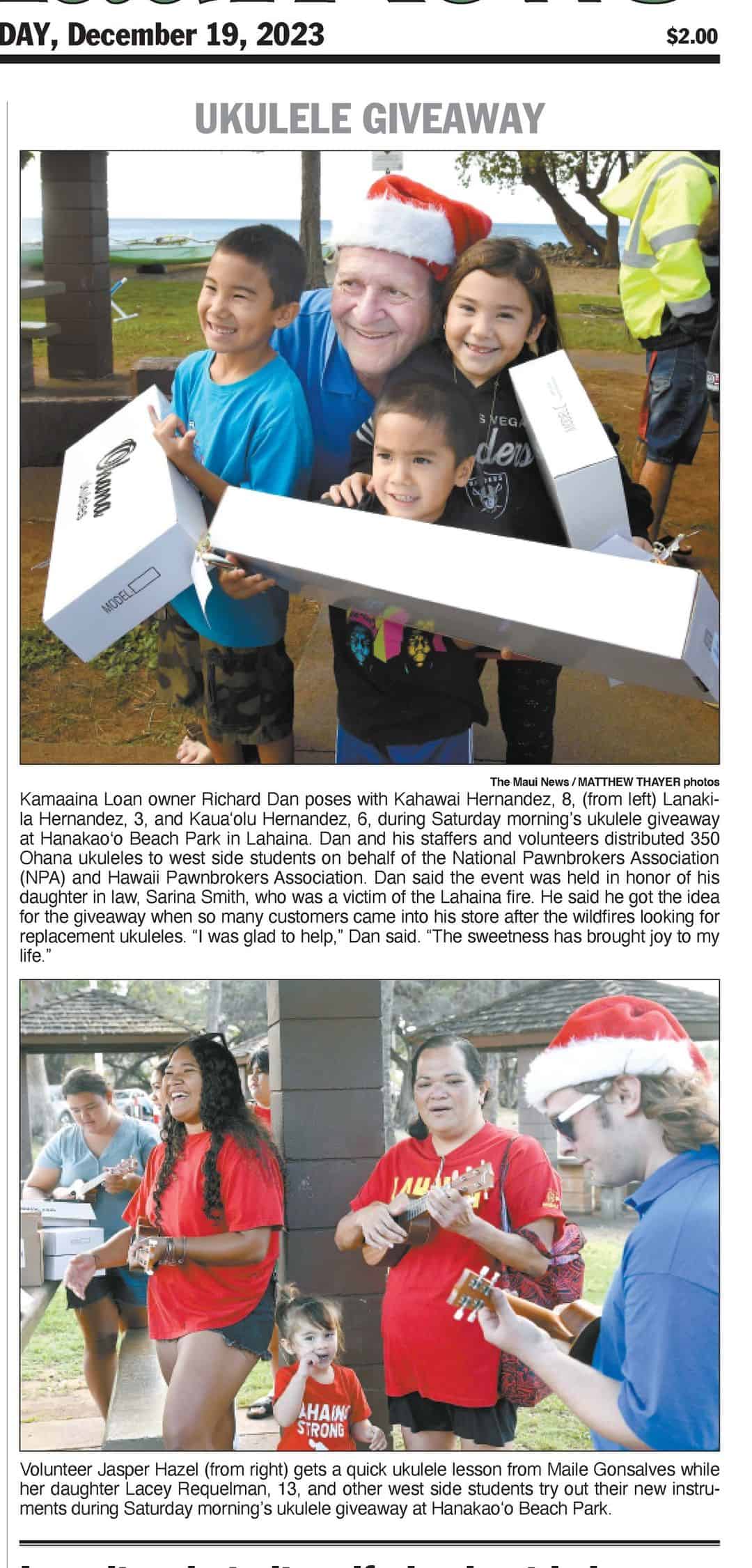 In partnership with the Hawaii Pawnbrokers Association and the National Pawnbrokers Association, Richard Dan was able to raise funds from across the country to build on his initial donation. Together, the pawnbrokers raised enough for money for 400 Ohana ʻukulele which have been distributed to students in Lahaina. Teachers from the local schools assisted with the distribution at Hanakaʻōʻō Beach Park shortly before Christmas.